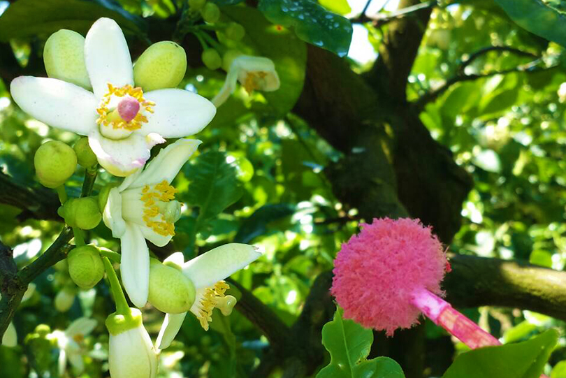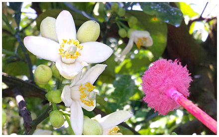 美味しい文旦作りには、受粉からこだわっています。文旦の受粉には、同じ千の果樹園で育てられた、宿毛小夏の花粉を使っています。より多くの種を入れることで一粒一粒の実がしっかりとした、果汁の多い、甘い文旦が出来上がります。